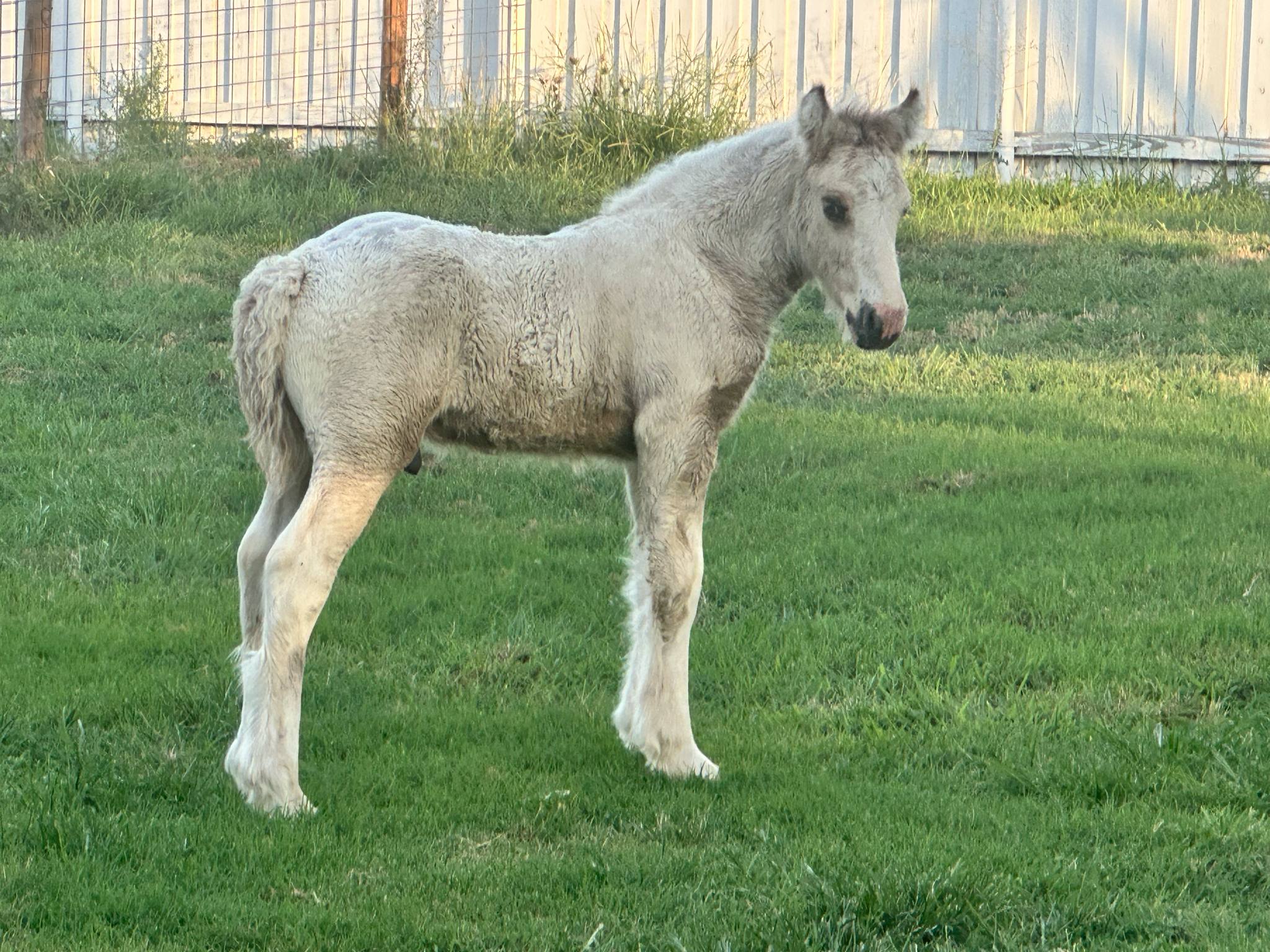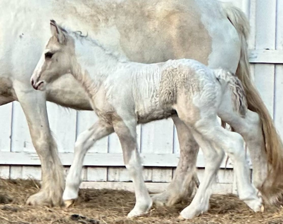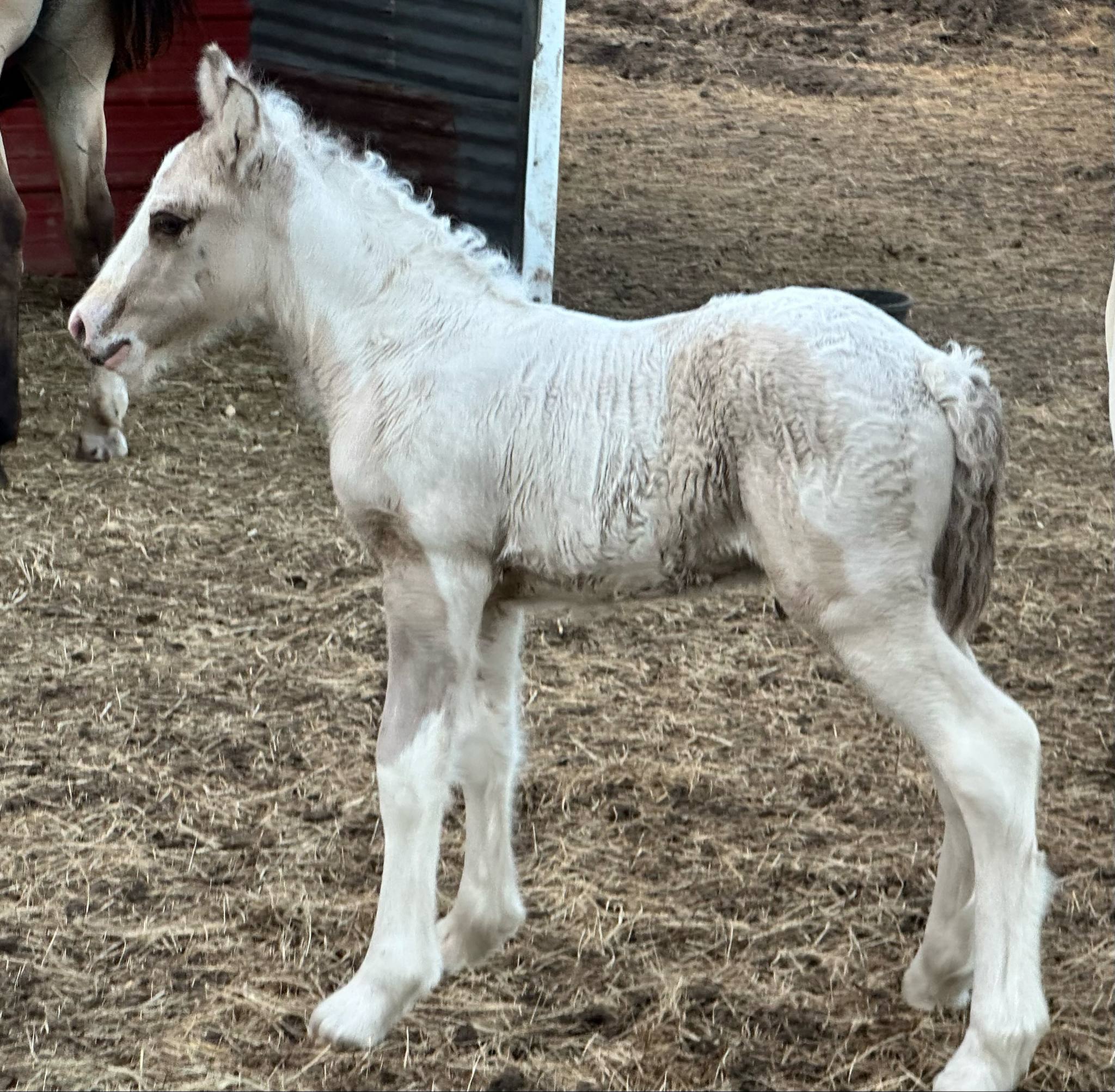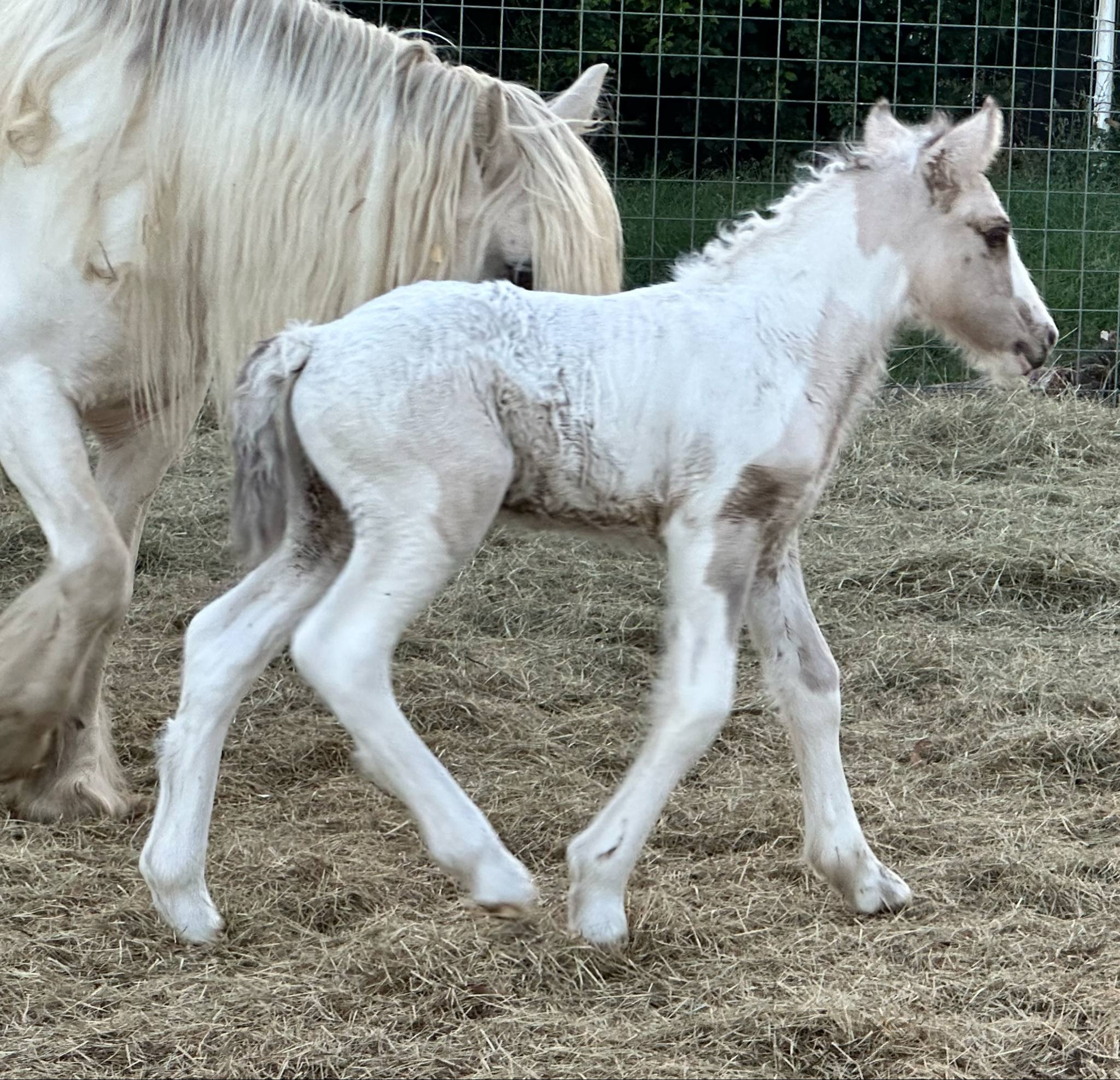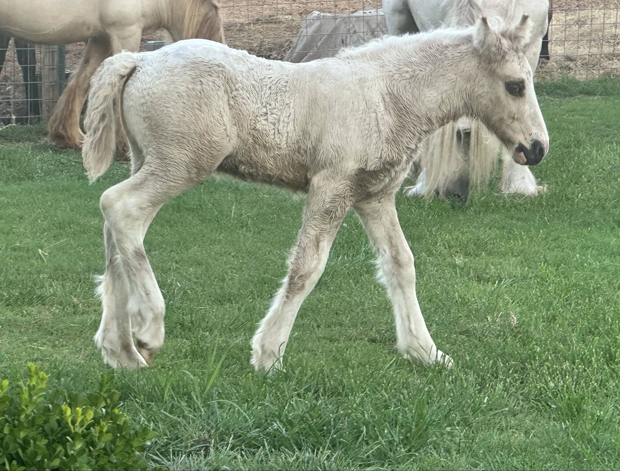 Stunning colt with all the fancy trimmings you could ask for. Beautiful head, tippy little ears, beautiful neck and short couple back. Combined with nice solid bone and lovely feather, this boy is a winner all the way around. He has Silver, Cream, and Dun to fit any of your mares, or be a showstopper gelding. Tons of potential with little boy and his sire is KNOWN for producing top quality Gypsy Vanners. Wonderful bloodlines back up this little colt and the foundation is set for whatever you'd like to do with him.