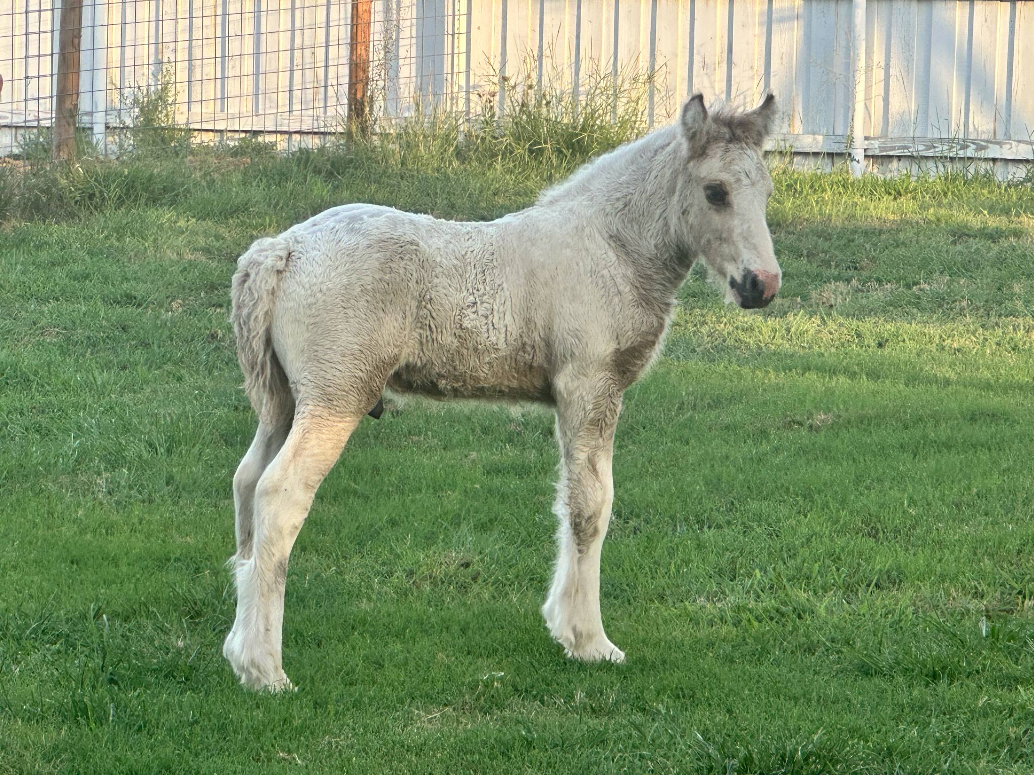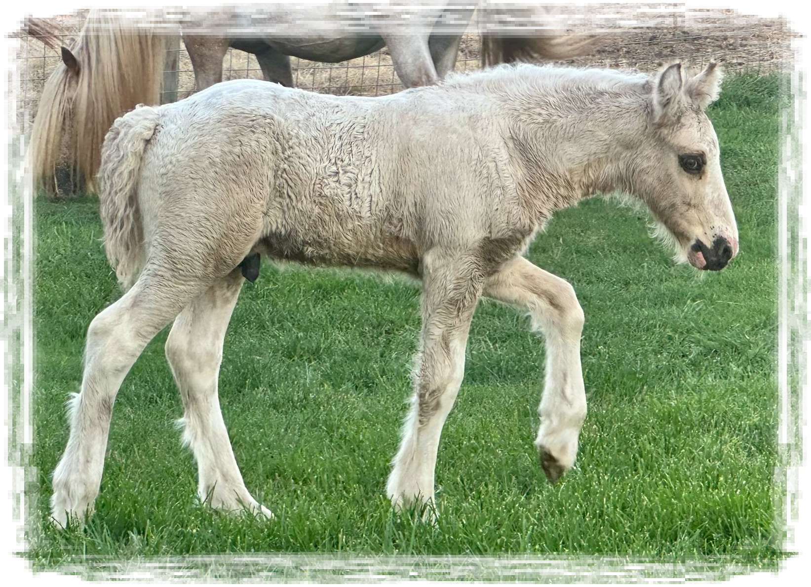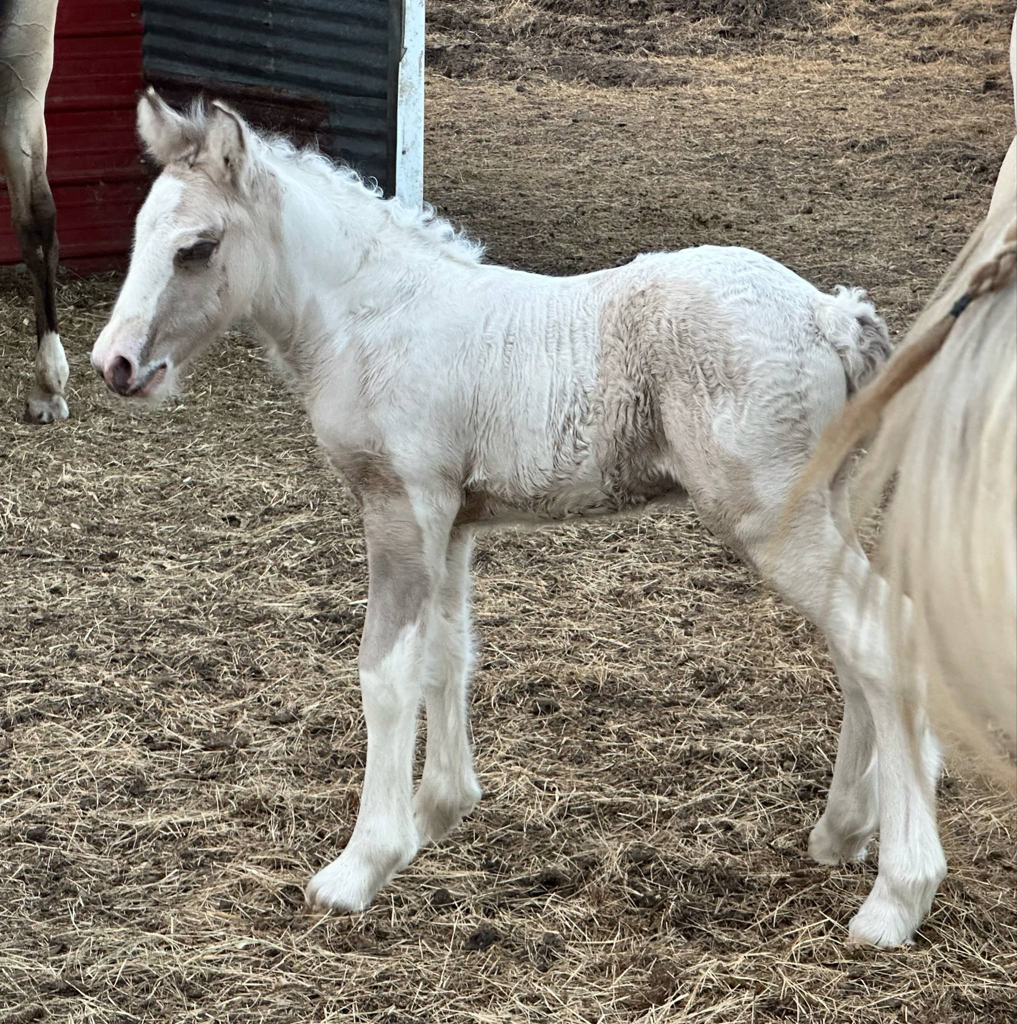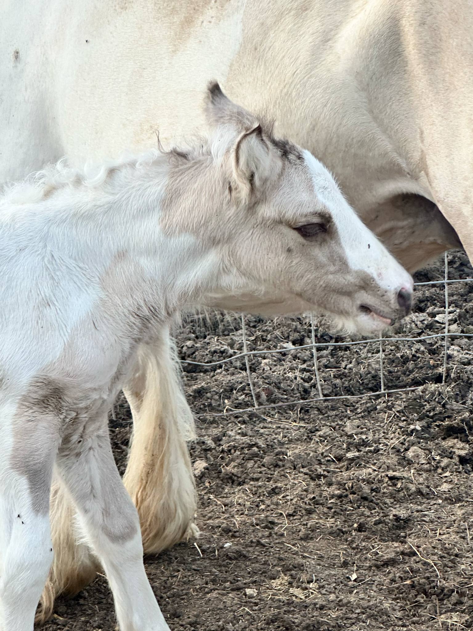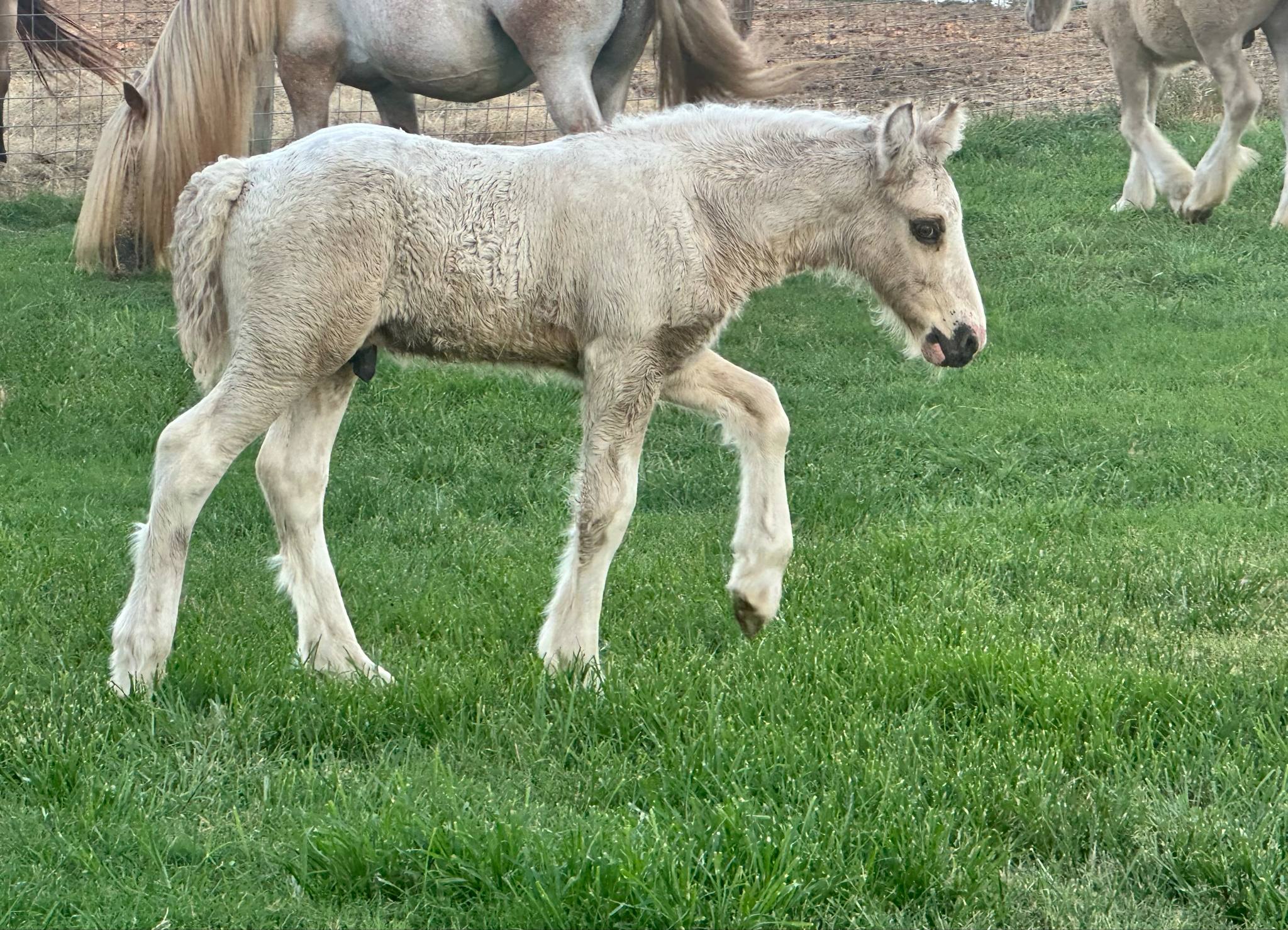 Stunning colt with all the fancy trimmings you could ask for. Beautiful head, tippy little ears, beautiful neck and short couple back. Combined with nice solid bone and lovely feather, this boy is a winner all the way around. He has Silver, Cream, and Dun to fit any of your mares, or be a showstopper gelding. Tons of potential with little boy and his sire is KNOWN for producing top quality Gypsy Vanners. Wonderful bloodlines back up this little colt and the foundation is set for whatever you'd like to do with him.